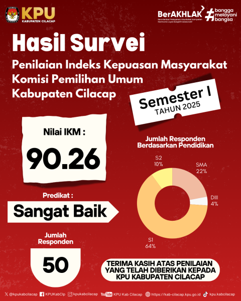 Ketua KPU Kabupaten Cilacap, Weweng Maretno, S.Sos., menyampaikan apresiasi kepada masyarakat yang telah berpartisipasi dalam survei ini. “Hasil penilaian dengan kategori sangat baik ini menjadi motivasi bagi kami untuk terus memperkuat pelayanan publik yang transparan, akuntabel, dan responsif terhadap kebutuhan masyarakat,” ujarnya.