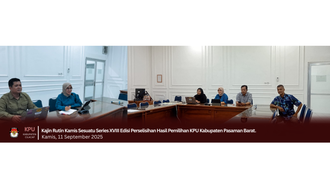 CILACAP- Komisi Pemilihan Umum (KPU) Kabupaten Cilacap hadir dalam kegiatan Kajian Rutin “Kamis Sesuatu” Seri ke XVIII Divisi Hukum dan Pengawasan Tahun 2025 dengan Putusan Perkara Nomor 4/PHPU.BUP-XXIII/2025 PHPU Bupati dan Wakil Bupati Pasaman Barat Tahun 2024 yang diselenggarakan oleh KPU Provinsi Jawa Tengah Kamis (11/9/2025). Hadir dalam kegiatan tersebut Divisi Hukum dan Pengawasan (Munjiatun Mukaromah), Kasubag Teknis Penyelenggaraan Pemilu dan Hukum (Hari Sugiarto) dan Staf Hukum (Aini Auliya dan Haryono).