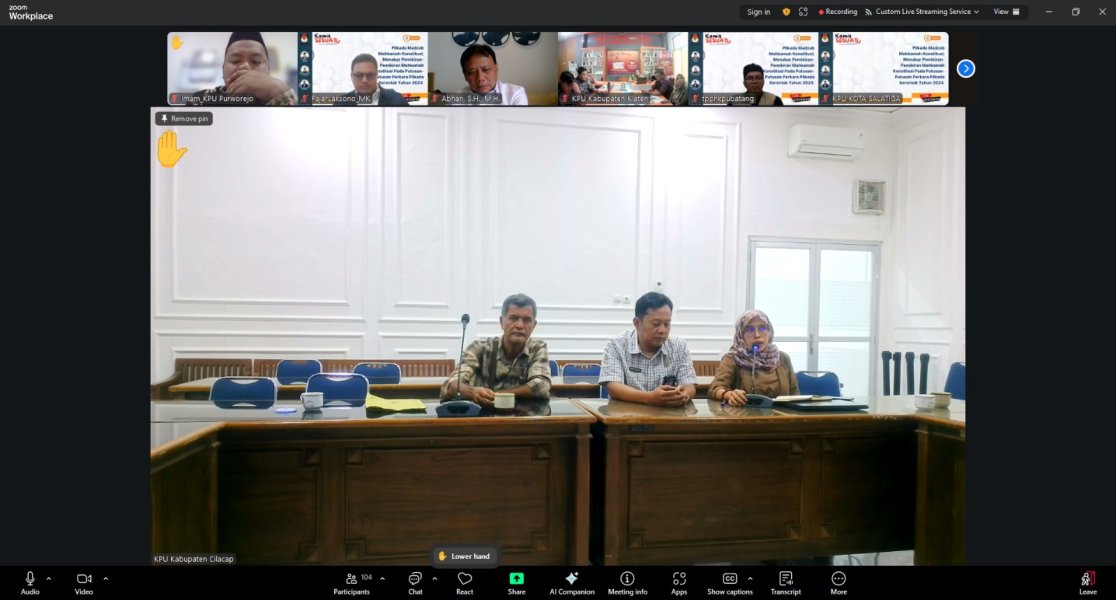Rabu 28 Mei 2025 KPU Kabupaten Cilacap hadir dalam kajian rutin kamis sesuatu yang di selenggarakan oleh KPU Provinsi jawa Tengah yang ikuti oleh peserta Divisi Hukum dan Pengawasan, Kasubag Teknis dan Hukum dan Sataf Hukum, Untuk KPU Kabupaten Cilacap sendiri hadir yakni Divisi Hukum dan Pengawasan (Munjiatun Mukaromah) Kasubag Teknis dan Hukum (Hari Sugiarti) Staf Hukum (Zulfan Hukami dan Haryono) Melalui Zoom meeting. Kegiatan di mulai pada pukul 09.00 WIB yang di buka langsung oleh Ketua KPU KPU Provinsi Jawa Tengah (Handi Tri Ujiono)