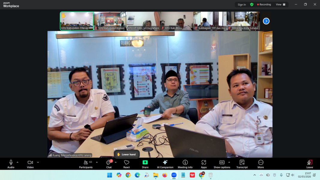 Cilacap- Kamis, 2 Maret 2026 KPU Kabupaten Cilacap hadir dalam Rapat Koordinasi Rencana Kegiatan Divisi Hukum dan Pengawasan yang diselenggarakan oleh KPU Provinsi Jawa Tengah yang di ikuti oleh peserta Divisi Hukum dan Pengawasan, Kasubag Teknis dan Hukum dan Staff Hukum se Jawa Tengah, Untuk KPU Kabupaten Cilacap sendiri hadir yakni Divisi Hukum dan Pengawasan (Munjiatun Mukaromah), Kasubag Teknis dan Hukum (Hari Sugiarto) Staf Hukum (Zulfan Hikami, Aini Auliya dan Haryono) dan kegiatan dilaksankan secara daring Melalui Zoom meeting.
