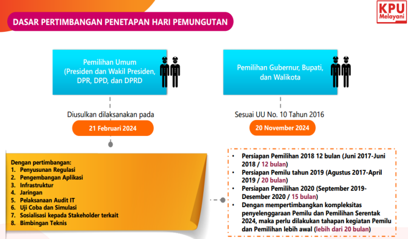 Selaku lembaga yang memiliki kewenangan menentukan jadwal pelaksanaan pemilu dan pemilihan sesuai dengan amanat Undang-Undang, KPU dalam mengajukan usulan tentu sudah mempertimbangan aspek dasar dan pertimbangan sosial. Tidak mengabaikan juga atas saran dan masukan yang diberikan oleh stakeholder sehingga pilihan hari pemungutan suara untuk pemilu tahun 2024 jatuh pada tanggal 21 Februari 2024.