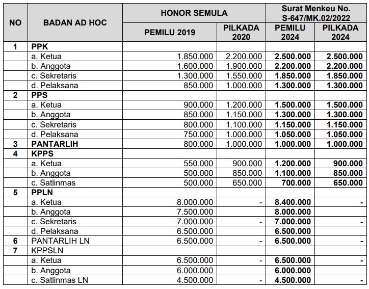 Berdasarkan Surat Menteri Keuangan Nomor S-647/MK.02/2022 tanggal 05 Agustus 2022 perihal Satuan Biaya Masukan Lainnya (SBML) Tahapan Pemilihan Umum dan Tahapan Pemilihan, Pemerintah telah menyetujui kenaikan honor bagi badan ad hoc untuk Pemilu dan Pemilihan Tahun 2024 (PPK, PPS, KPPS, Pantarlih, PPLN, KPPSLN, Pantarlih LN), dibandingkan Pemilu Tahun 2019 dan Pemilihan Tahun 2020. Kenaikan honor badan ad hoc, sebagaimana tabel berikut: