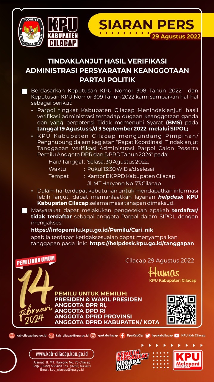 Siaran Pers: Tindak Lanjut Hasil Verifikasi Administrasi Keanggotaan Partai Politik