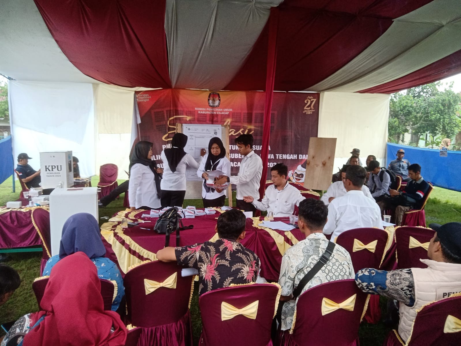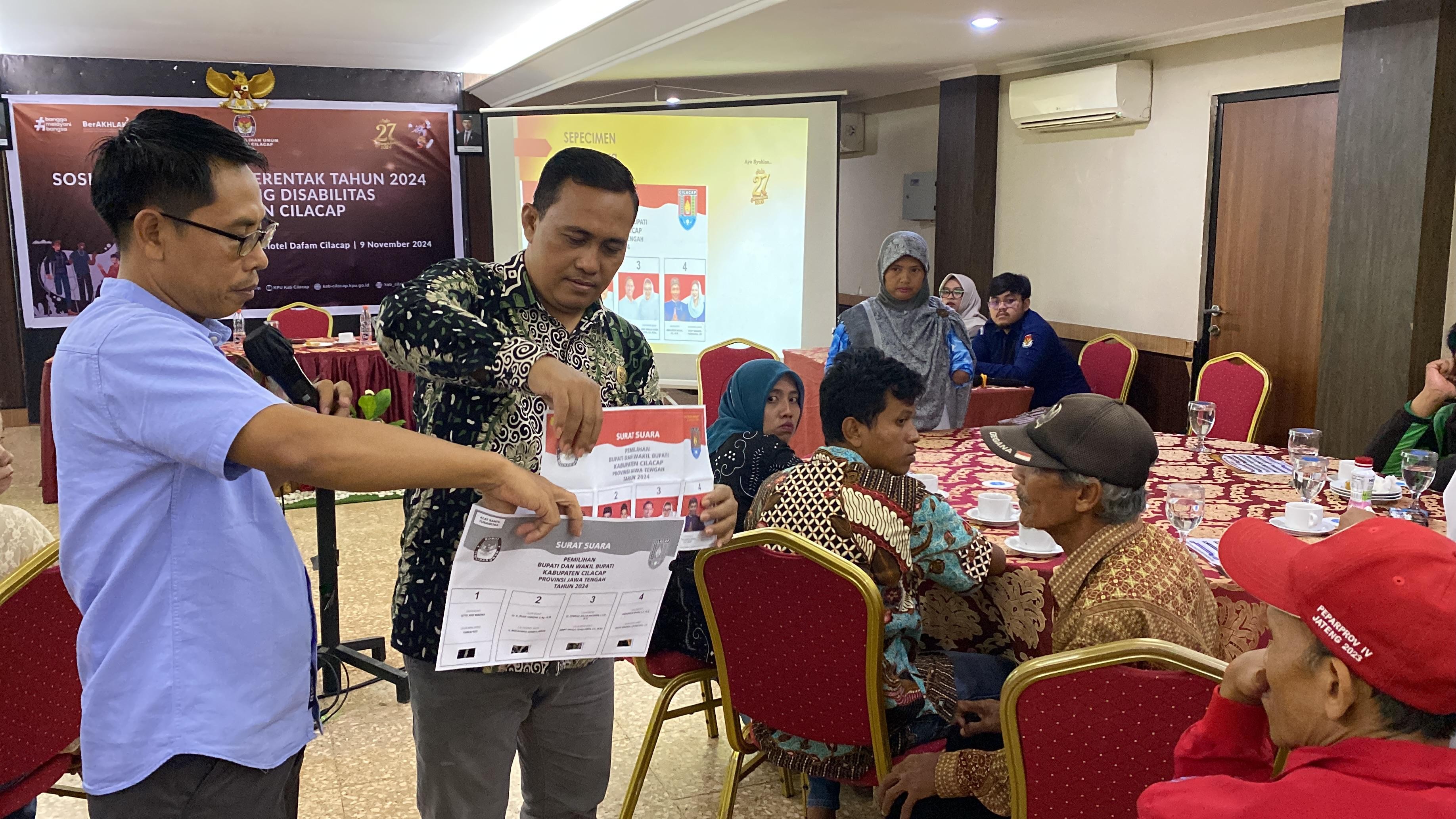 Anggota KPU Cilacap Divisi Sosialisasi dan Pendidikan Pemilih, M. Muhni bersama Tarmin Ngaklak, dalam kesempatan ini menyampaikan informasi tentang Pasangan Calon Gubernur dan Wakil Gubernur Jawa Tengah dan Pasangan Calon Bupati dan Wakil Bupati Cilacap kepada seluruh masyarakat Kabupaten Cilacap serta mengajak untuk tidak Golput. Ayo datang ke TPS pada tanggal 27 November 2024.