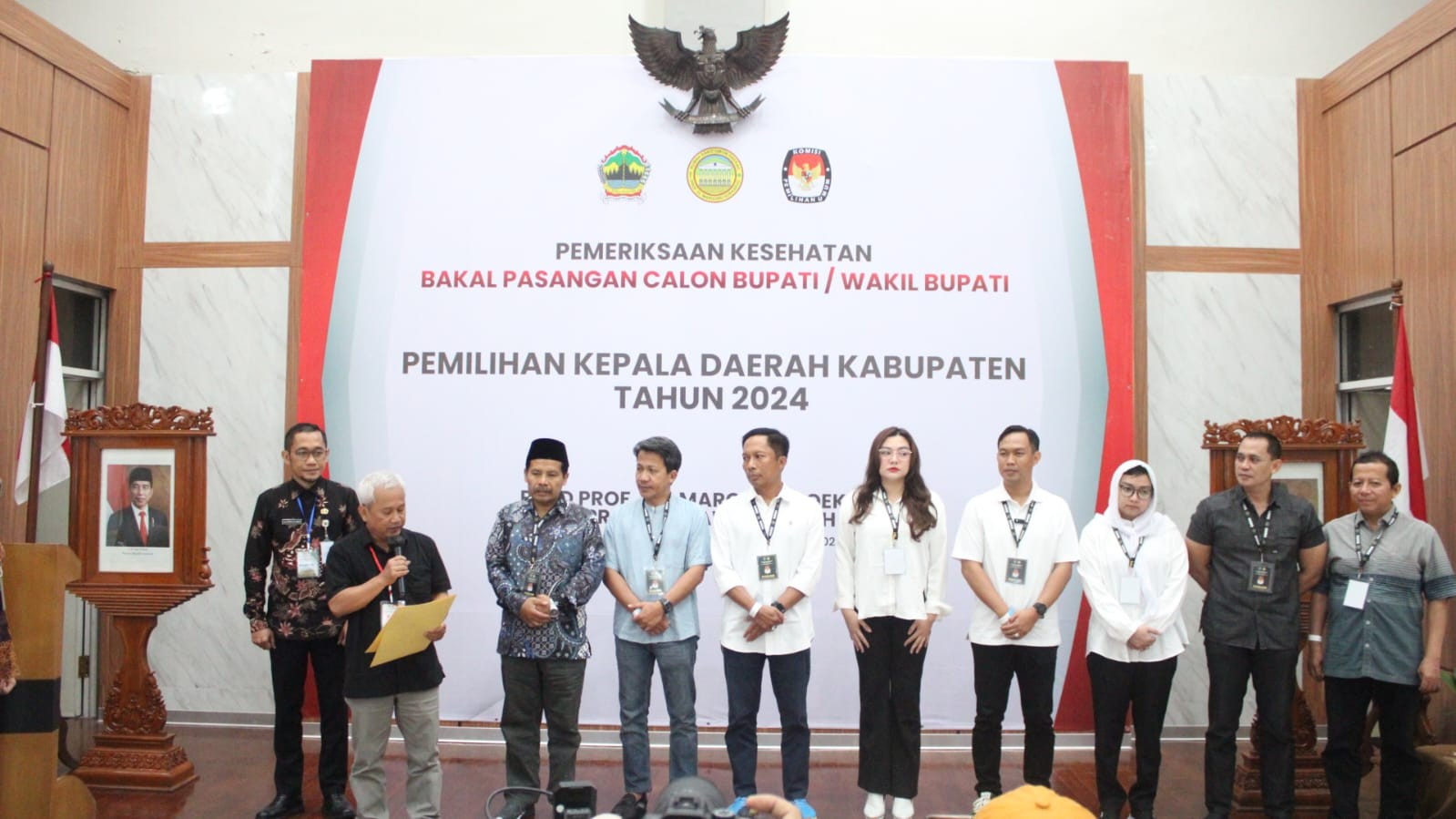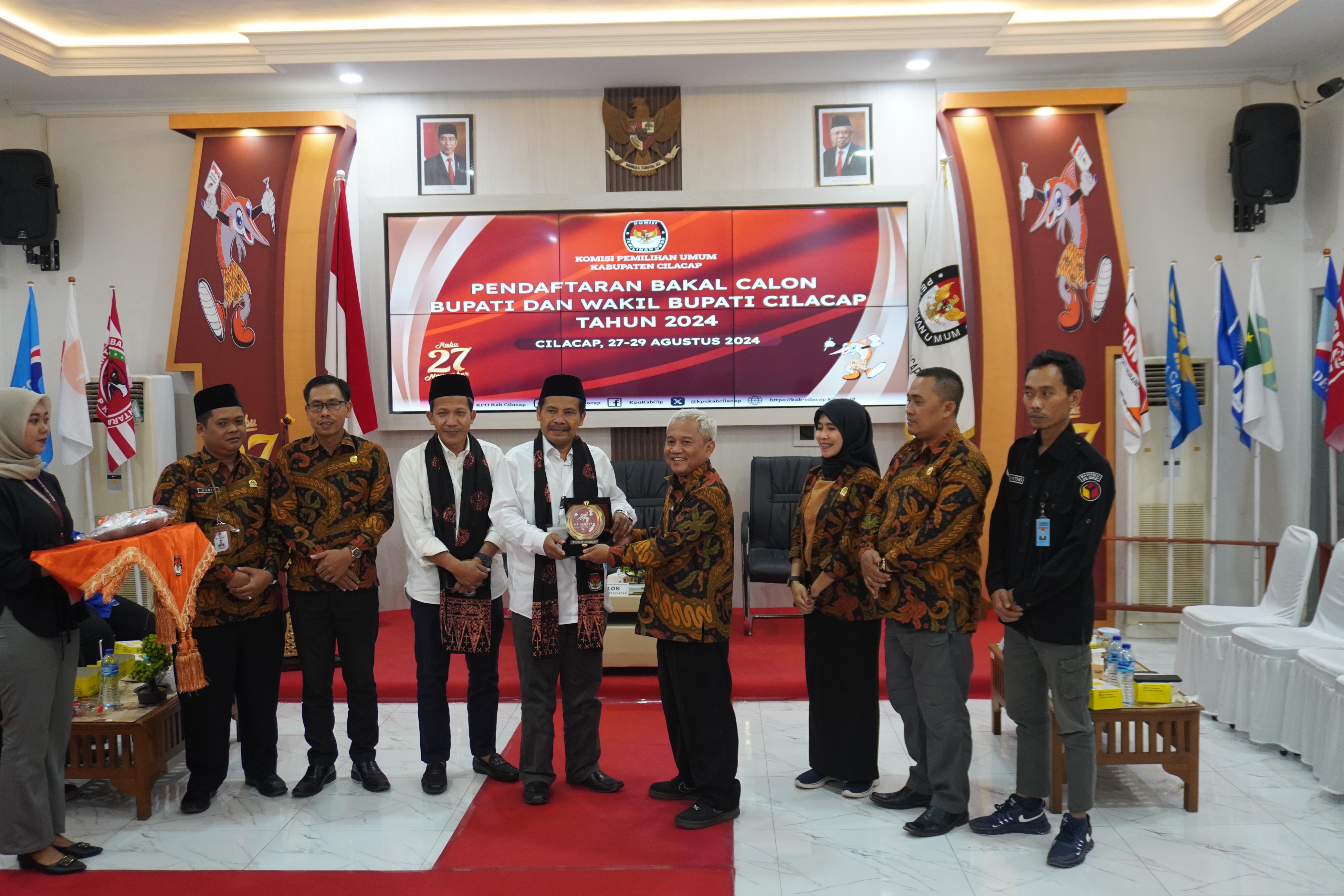 Cilacap - Empat Pasangan Calon (paslon) Bupati dan Wakil Bupati telah resmi mendaftar ke KPU Kabupaten Cilacap dalam tenggat waktu tiga hari masa pendaftaran (27-29/8/2024). Paslon masing-masing mendaftar dengan didampingi pimpinan partai politik pengusul, Liaison Officer (LO) dan operator Silonpilkada yang ditunjuk oleh parpol atau gabungan parpol. Di hari pertama tidak ada paslon yang mendaftar. Baru di hari kedua, satu paslon yakni Dr. H. Imam Tobroni, S. Ag., M.M. berpasangan dengan Ir. Mochamad Sonhaji Imron mengajukan pendaftaran. Di hari ketiga, yang merupakan hari terakhir pendaftaran, tiga paslon mendaftar berurutan yakni Awaluddin Muuri, S.AP.MM berpasangan dengan Vicky Veranita Yudhasoka, disusul oleh DR. Syamsul Aulia Rachman, S.STP, M.Si berpasangan dengan Ammy Amalia Fatma Surya, S.H., M.Kn dan terakhir Setyo Budi Wibowo berpasangan dengan Fahrurozi, S.IP., M.Hum. Masing-masing merupakan paslon yang cukup populer dikalangan masyarakat Kabupaten Cilacap. Sampai dengan pendaftaran ditutup tepat pukul 23.59 WIB, tidak ada lagi pasangan lain yang mendaftar. Pada sesi konferensi pers, Ketua KPU Kabupaten Cilacap (Weweng Maretno) mengucapkan terima kasih kepada Tim pendaftaran, Peserta Pemilih, relawan pasangan calon, Tim gabungan pengamanan (Polresta, Kodim, Lanal, Satpol PP dan Pokdar kelurahan Donan) dan Bawaslu sehingga pelaksanaan berjalan tertib aman dan lancar.