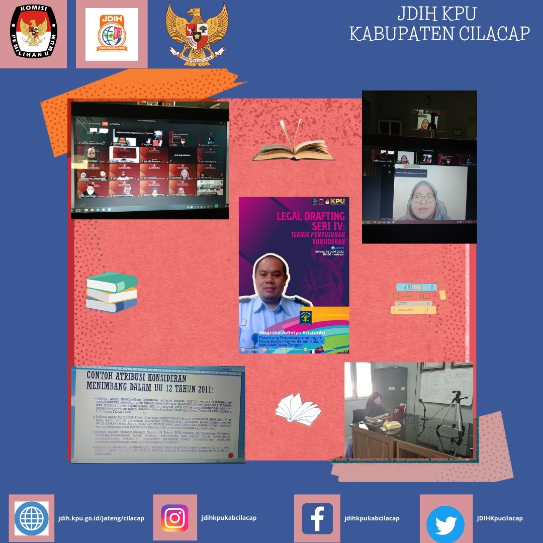 Selasa 14 Juni 2022 KPU Kabupaten Cilacap menghadiri undangan Bimtek Legal Drfating Seri IV (empat) yang di selenggarakan oleh KPU Provinsi Jawa Tengah. Bimtek dilaksanakan secara daring melalui zoom meeting. Peserta yang hadir adalah Divisi Hukum dan Pengawasan, Kasubag hukum dan SDM beserta Staf Hukum Komisi Pemilihan Umum se Jawa Tengah. Acara di mulai pada pukul 09.00 WIB sampai dengan selesai. Adapun KPU Kabupaten Cilacap hadir yakni Divisi Hukum dan Pengawasan (Munjiatun Mukaromah), Kasubag Hukum dan SDM (Hari Sugiarto) dan Staf Hukum (Zulfan Hikami). Rapat dibuka langsung oleh Kasubag Hukum dan SDM KPU Provinsi Jawa Tengah Kemudian di Lanjutkan Oleh pemateri Nugraha Adhitya Kristanto perancang Perundang - undangan muda dari Kantor wilayah Kementrian Hukum dan HAM Jawa Tengah. Pembahasan dalam bimtek ini adalah Teknik Penyusuan Konsideran. Sebagimana angka angka 17 sampai dengan angka 27 lampiran II UU nomor 12 tahun 2011 tentang Pembentukan Peraturan Perundang- Undangan di sampaikan bahwa konsideran diawali dengan kata “Menimbang” yang memuat pokok pikiran yang menjadi pertimbangan dan alasan pembentukan peraturan perundang-undangan. Pokok pikiran pada konsideran Peraturan Perundang – undangan memuat unsur filosofis, sosiologis, dan yuridis yang menjadi pertimbangan dan alasan dibentuknya peraturan tersebut yang penulisanya di tempatkan secara berurutan dari filosofis, sosiologis, dan yuridis. Konsideran yang terdiri dari Unsir Filosofis, Sosiologis dan Yuridis biasa di kenal dengan istilah “Atribusi” Penjelasan Unsur Filosofis, Sosiologis dan Yuridis Unsur filosofis adalah menggambarkan bahwa peraturan yang di bentuk mempertimbangkan pandangan hidup, kesadaran,dan cita hukum yang meliputi suasana kebatinan serta falsafah bangsa Indonesia yang bersumber dari pancasila dan pembukaan undang-undang dasar Negara Republik Indonesia Tahun 1945. Unsur Sosiologis menggambarkan bahwa peraturan yang di bentuk memenuhkebutuhan masyarakat dalam berbagai aspek. Sedangkan penjelasan unsur Unsur Yuridis menggambarkan bahwa peraturan yang di bentuk untuk mengatasi permasalahan hukum atau mengisi kekosongan hukum dengan mempertimbangkan aturan yang telah ada yang akan di ubah atau yang akan dicabut menjamin kepastian hukum an rasa keadilan masyarakat. Tujuan dari bimtek ini adalah untuk meningkatkan kapasitas dalam penyusunan regulasi di lingkungan KPU Kabupaten/Kota se Jawa Tengah.