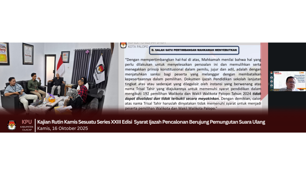 Kamis, 16 Oktober 2025 KPU Kabupaten Cilacap hadir dalam kajian rutin “Kamis Sesuatu” yang di selenggarakan oleh KPU Provinsi Jawa Tengah yang ikuti oleh peserta Divisi Hukum dan Pengawasan, Kasubag Teknis dan Hukum dan Staff Hukum Se Jateng, Untuk KPU Kabupaten Cilacap sendiri hadir yakni Ketua KPU Kabupaten Cilacap (Weweng Maretno), Divisi Hukum dan Pengawasan (Munjiatun Mukaromah), Kasubag Teknis dan Hukum (Hari Sugiarto) Staff Hukum (Haryono, Zulfan Hikami dan Aini Auliya) Melalui Zoom meeting. Kegiatan di mulai pada pukul 09.00 WIB. Kegiatan dibuka oleh Paulus Widiyantoro selaku Ketua Divisi Data dan Informasi Provinsi Jawa Tengah, dilanjutkan Pengantar dari Divisi Hukum dan Pengawasan KPU Provinsi Sulawesi Selatan Upi Hastati. Kemudian di lanjutkan oleh Narsumber dengan di pandu oleh Moderator Kasubag Teknis Penyelenggaraan Pemilu dan Hukum KPU Kabupaten Demak dengan Pembahasan Amar Putusan Mahkamah Konstitusi nomor 168 Tahun 2025 tentang Putusan Perselisihan Hasil Pemilihan Walikota dan Wakil Walikota Palopo Tahun 2024. Narasumber kali ini yaitu Divisi Hukum dan Pengawasan Kota Palopo dan Divisi Hukum dan Pengawasan Kabupaten Demak kemudian di akhiri dengan pengarahan dan kesimpulan dari Divisi Hukum dan Pengawsan KPU Provinsi Jawa Tengah (Muslim Aisha) dan Diskusi tanya Jawab oleh peserta. Tujuan dari Kegiatan ini mengkaji secara detail terkait sengketa dan dinamika yang terjadi di KPU Kota Palopo. Persolan yang di hadapi, Persoalan yang di soalkan di MK dan Putusan yang di keluarkan oleh MK dan serta bagaimana Penyelesainya. Persoalan yang di hadapi oleh KPU Kota Palopo adalah terkait gugatan oleh Pemohon Pasangan Calon Walikota dan Wakil Walikota Palopo Nomor Urut 2 (Dua) Tahun 2024 dengan Termohon adalah KPU Kota Palopo dan Pihak terkait adalah Pasangan Calon Walikota dan Wakil Walikota Palopo Nomor Urut 4 (Empat) Tahun 2024 di Mahkamah Konstitusi yang berdampak pada Pemungutan Suara Ulang (PSU) dan diskualifikasi Calon Walikota Nomor urut 4 (Trisal Tahir). Pemohon dalam Pokok Permohonnya yaitu MK menyatakan batal: Keputusan Komisi Pemilihan Umum Kota Palopo Nomor 620 Tahun 2024 Tentang Penetapan Hasil Pemilihan Walikota Dan Wakil Walikota Palopo Tahun 2024 Keputusan Komisi Pemilihan Umum Kota Palopo Nomor 339 Tahun 2024 Tentang Penetapan Pasangan Calon Peserta Pemilihan Walikota Dan Wakil Walikota Palopo Tahun 2024 Keputusan Komisi Pemilihan Umum Kota Palopo Nomor 340 Tentang Penetapan Nomor Urut Pasangan Calon Peserta Pemilihan Walikota Dan Wakil Walikota Palopo Tahun 2024, Tertanggal 23 September 2024. Pemohon menduga bahwa jumlah suara yang didapatkan oleh pihak terkait dikarenakan adanya pelanggaran administrasi pemilihan yaitu Ijazah Paket C dengan Nomor DN-01 PC 002281 milik Tristal Tahir. Setelah dilaksanakan klarifikasi kepada Suku Dinas Pendidikan Wilayah II Kota Administrasi Jakarta Utara melalui surat diketahui fakta bahwasannya ijazah milik Trital Tahir tidak terdaftar di Suku Dinas Pendidikan Wilayah II Kota Administrasi Jakarta Utara. Kronologinya sebagai berikut sengketa terjadi pada tahapan pencalonan yaitu terkait persyaratan pencalonan, pada saat klarifikasi keabsahan dokumen persyaratan pecalonan yang dilakukan oleh KPU Palopo telah di temukan ketidaksesuaian ijazah calon walikota no urut 4 (empat). dari hasil klarifikasi tersebut maka di umumkan tidak memenuhi syarat (TMS) terhadap pengumuman tersebut calon walikota No 4 mengajukan sengketa ke Bawaslu Palopo, di sengketa Bawaslu Palopo tersebut terjadilah mediasi musyawarah kesepakatan, dimana dalam musyawarah kesepakatan salah satunya KPU Palopo melakukan klarifikasi terhadap keabsahan status ijazah ke PKBM, partai pengusul dan Calon. Dengan pengawasan melekat oleh bawaslu Palopo, hasil klarifikasi ke PKBM di nyatakan bahwa ijazah tersebut statusnya sesuai. Mendasari tindak lanjut mediasi tersebut akhirnya KPU Palopo menetapkan pasangan calon no urut 4 yang semula Tidak memenuhi syarat (TMS) menjadi Memenuhi Syarat (MS) dan kemudian di tetapkan sebagai calon walikota tahun 2024 pada tanggal 23 september 2024. Pada tanggal 28 oktober 2024 KPU palopo menerima surat rekomendasai dari Bawaslu Palopo untuk kembali me TMS kan calon walikota no urut 4 (empat), terhadap surat rekomendasi tersebut KPU palopo menolak dan tidak menindak lanjuti untuk me TMS kan. Dan waktupun berjalan sampai dengan pemungutan dan penghitungan dan calon walikota no urut 4 mendapat suara terbanyak. Dan perselisihan hasil pemilihan pun di mulai adanya gugatan dari calon walikota no urut 2 (dua) terhadap calon walikota no urut 4 (empat), dengan pokok permohonan mempersoalkan status ijazah tersebut, permohonan Pemohon di kabulkan sebagian oleh Mahkamah Konstitusi (MK), dengan bukti dan fakta dalam persidangan di MK dan berujunag pada Pemungutan Suara Ulang (PSU) dan diskulaifikasi calon Walikota no urut empat (4) Harapan dalam kegiatan ini adalah bertambahnya pengetahuan dan Pembelajaran bersama terhadap dinamika yang terjadi di KPU Kota Palopo dalam tahapan Penyelenggaraan Pemilihan, dan sebagai gambaran sebagai mitigasi resiko dan Pemetaan Potensi masalah Hukum dalam Setiap tahapan penyelenggaraan Pilkada selanjutnya untuk lebih baik lagi. Divisi Hukum dan Pengawasan (Munji dan Aini)