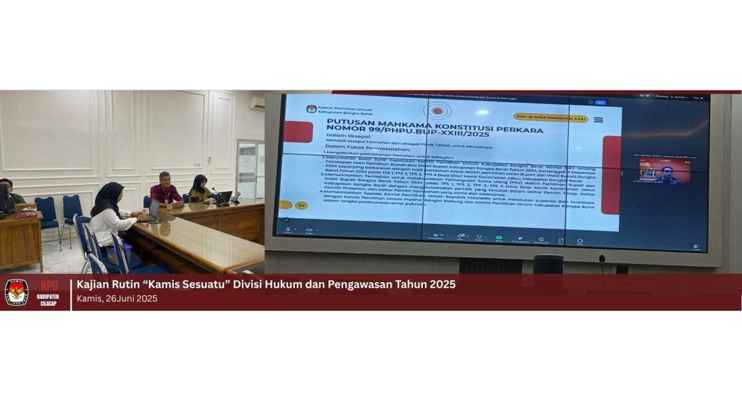 Kamis 26 Juni 2025 KPU Kabupaten Cilacap hadir dalam kegiatan Kajian Rutin kamis sesuatu yang di selenggarakan oleh KPU Provinsi jawa Tengah yang ikuti oleh Divisi Hukum dan Pengawasan, Kasubag Teknis dan Hukum dan Staf Hukum Se Jawa Tengah, dan Untuk KPU Kabupaten Cilacap sendiri hadir yakni Divisi Hukum dan Pengawasan (Munjiatun Mukaromah) Kasubag Teknis dan Hukum (Hari Sugiarto) Staf Hukum (Zulfan Hukami, Aini dan Haryono) kegiatan di laksanakan secara Daring Melalui Zoom meeting. Kegiatan di mulai pada pukul 09.00 WIB yang di buka oleh anggota KPU Provinsi Jawa Tengah (Paulus Widiantoro) Kemudian di awali dengan Pengantar oleh Divisi Hukum dan Pengawasan KPU Provinsi Bangka Belitung (Muslim Anshori) Kemudian di lanjutkan oleh Narasumber dengan di pandu oleh Moderator Kasubag Hukum dan pengawasa dari KPU Rembang, Pembahasan dalam giat kali ini terkait Amar Putusan Mahkamah Konstitusi nomor 99 Tahun 2025 tentang Putusan Perselisihan Hasil Pemilihan Bupati dan wakil Bupati KPU Kabupaten Bangka Barat. Pembahasan di paparkan oleh dua Narsumber dari KPU Kabupaten/Kota yaitu dari Divisi Hukum dan Pengawasan KPU Kabupaten Bangka Barat (Riska Ramadhan) dan Divisi Hukum Pengawasan KPU Kabupaten Rembang (Moh Zaenal Arifin) kemudian diskusi Tanya Jawab oleh peserta dan di akhiri pengarahan dan kesimpulan dari Divisi Hukum dan Pengawsan KPU Provinsi Jawa Tengah (Muslim Aisha). Tujuan dari Kegiatan ini ialah mengkaji secara detail terkait sengketa dan dinamika yang terjadi di KPU Bangka Barat, Persolan yang di hadapi, Persoalan yang di soalkan di MK, pertimbangan Hukum Putusan MK dan serta bagaimana Penyelesainya. Persoalan yang di hadapi oleh KPU Bangka Barat adalah terkait gugatan oleh Pemohon Pasangan Calon Bupati Tahun 2024 No urut 1 (Satu) di Mahkamah Konstitusi yang berdampak pada Pemungutan Suara Ulang (PSU) di empat TPS Desa Sinar Manik Kecamatan Jebus Kabupaten Bangka Barat. KPU Kabupaten Bangka Barat sebagai Termohon di eksepsinya Menolak secara seluruhnya atas pokok perkara yang di dalilkan pemohon tetapi Mahkamah Konstitusi mengabulkan sebagian eksepsi Pemohon yaitu menyatakan batal keputusan KPU Bangka Barat Nomor …Tahun 2024 tentang Penetapan Hasil Pemilihan Bupati dan Wakil Bupati Tahun 2024 dan Memerintahkan KPU Bangka Barat untuk melakukukan Pemungutan Suara Ulang (PSU) Pemilihan Bupati dan Wakil Bupati Bangka Barat Tahun 2024. Harapan dalam kegiatan ini adalah Pembelajaran bersama terhadap dinamika yang terjadi di KPU Bangka Barat pada tahapan Penyelenggaraan Pemilihan, dan sebagai gambaran dalam melakukan mitigasi resiko dan melakukan Pemetaan Potensi masalah Hukum dalam Setiap tahapan Pilkada selanjutnya untuk lebih baik lagi.