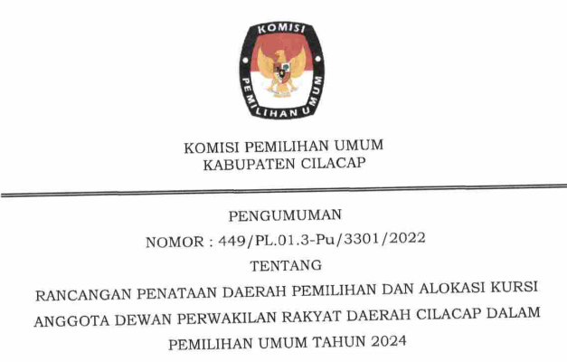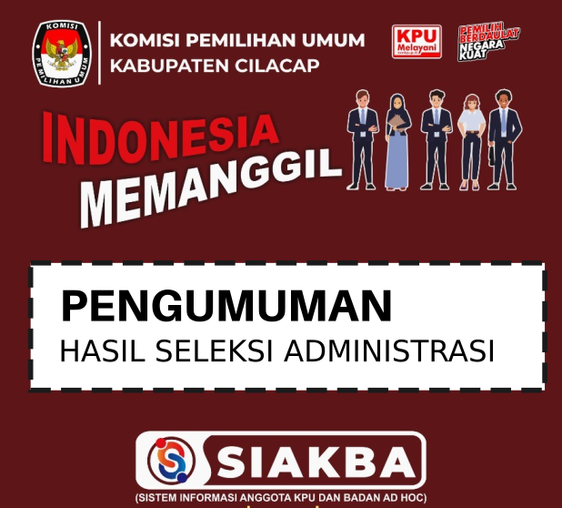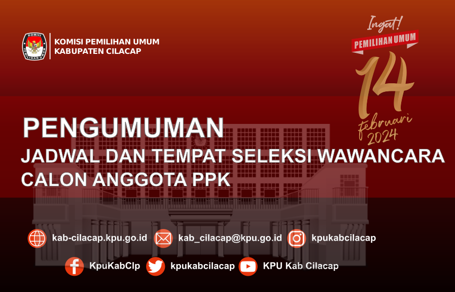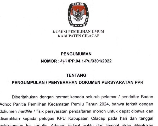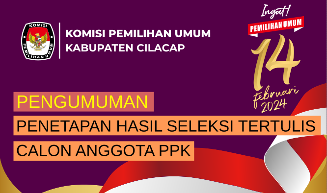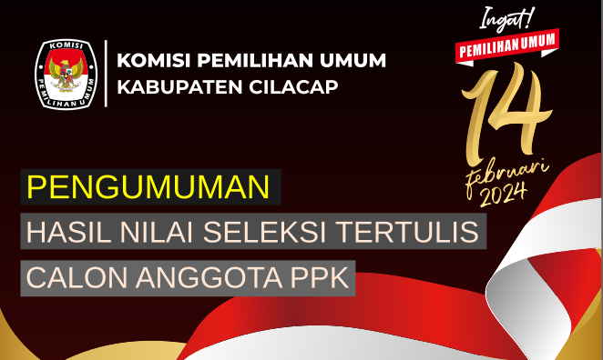 Bahwa KPU Kabupaten Cilacap telah melaksanakan tahapan seleksi tertulis bagi calon Anggota Panitia Pemilihan Kecamatan untuk Pemilu Tahun 2024 pada tanggal 6 Desember 2022 yang bertempat di Yayasan Al Irsyad Jl. Cerme No 24, Sidanegara, Cilacap Tengah dan SMK Komputama Jl. Yos Sudarso No.36A, Tanjungsari, Sindangsari, Majenang. Selanjutnya berdasarkan Berita Acara Rapat Pleno KPU Kabupaten Cilacap Nomor 32/PP.04.1-BA/3301/2022 tanggal 7-12-2022 tentang Penetapan Hasil Seleksi Tertulis Panitia Pemilihan Kecamatan untuk Pemilu Tahun 2024, dengan ini disampaikan hal-hal sebagai berikut : KPU Kabupaten Cilacap menetapkan hasil seleksi tertulis calon Anggota Panitia Pemilihan Kecamatan (PPK) untuk Pemilu Tahun 2024, sebagaimana daftar nama-nama terlampir; Bagi peserta yang telah dinyatakan lulus tahapan seleksi tertulis, diminta untuk mengikuti tahapan seleksi wawancara. Jadwal dan waktu wawancara akan diumumkan melalui website KPU Kabupaten Cilacap https://kab-cilacap.kpu.go.id/. Calon anggota Panitia Pemilihan Kecamatan yang mengikuti seleksi wawancara wajib memenuhi ketentuan: Melakukan registrasi peserta paling lambat 30 menit sebelum jadwal wawancara dimulai. Memakai baju putih dengan celana/bawahan warna gelap dan bersepatu; Membawa identitas KTP-el; Mematuhi protokol kesehatan dengan menggunakan masker; 4. Selanjutnya KPU Kabupaten Cilacap membuka tanggapan dan masukan masyarakat terhadap calon anggota PPK sampai dengan tanggal 10 Desember 2022. Tanggapan dan masukan dapat disampaikan melalui surat resmi yang dialamatkan kepada Kantor KPU Kab. Cilacap JL. MT Haryono No. 75 maupun e-mail sdmkpucilacap@gmail.com. Demikian pengumuman ini disampaikan untuk dapat menjadikan perhatian. Lampiran Hasil Seleksi Tertulis Calon Anggota PPK Nilai tiap peserta tes tertulis dapat dilihat dalam pengumuman nilai tertulis di tautan ini