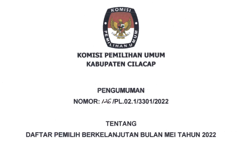 Dalam rangka pelaksanaan kegiatan Pemutakhiran Daftar Pemilih Berkelanjutan (PDPB) sesuai ketentuan pasal 20 huruf I Undang-Undang Nomor 7 Tahun 2017 tentang Pemilihan Umum, dan PKPU Nomor 6 Tahun 2021 tentang Pemutakhiran Data Pemilih Berkelanjutan serta mewujudkan daftar pemilih yang komprehensif, valid, dan mutakhir. Kami sampaikan kepada masyarakat Kabupaten Cilacap, Rekapitulasi dan By Name Perubahan Daftar Pemilih Berkelanjutan Periode Bulan Mei Tahun 2022 sebagaimana terlampir di bawah ini.