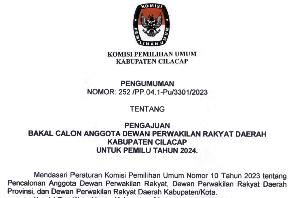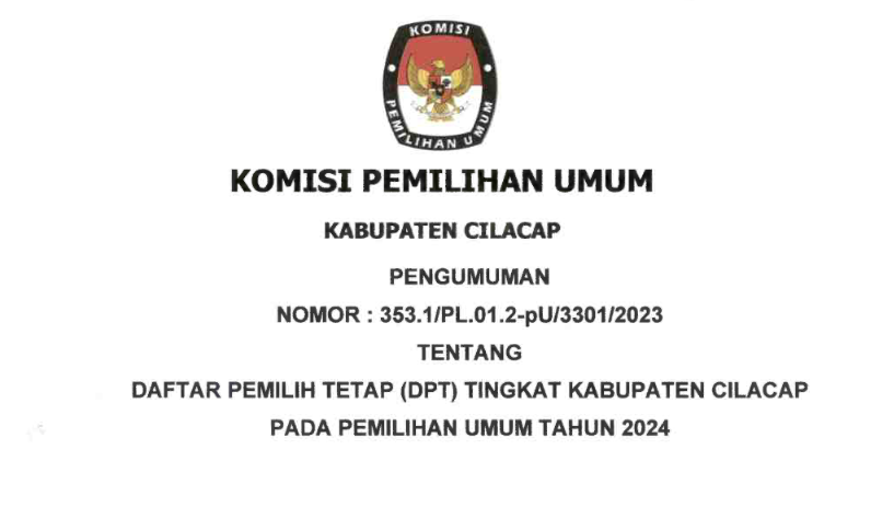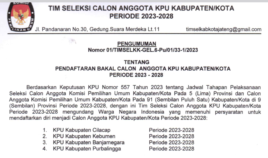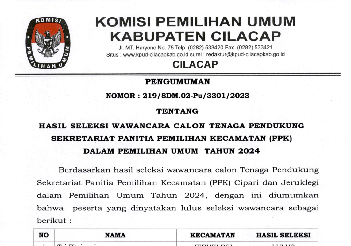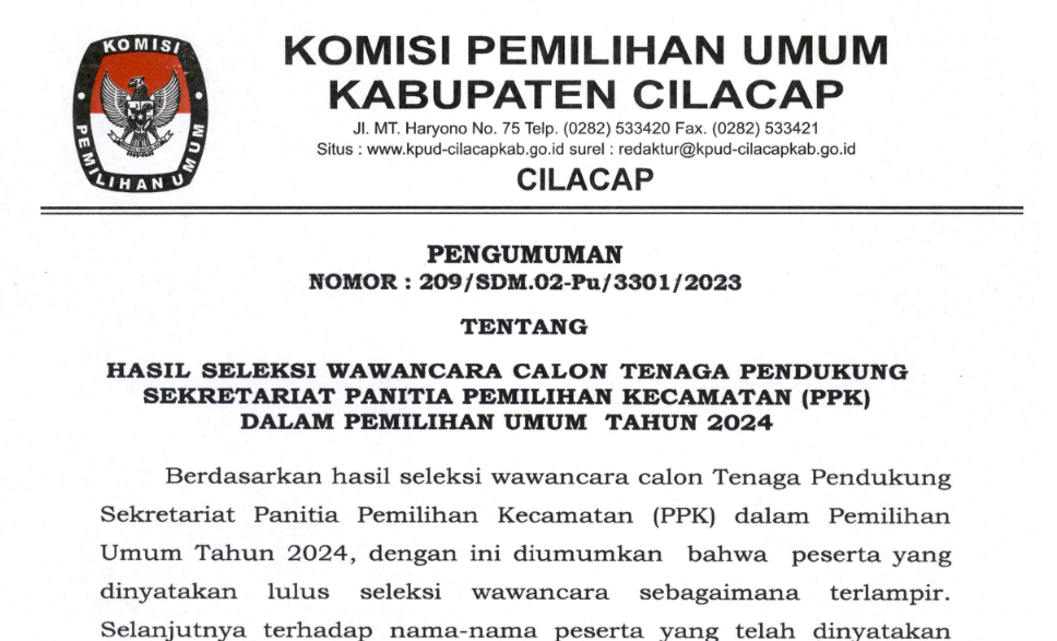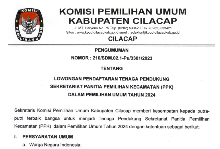 Disampaikan kepada masyarakat Pengumuman Nomor : 210/SDM.02-Pu/3301/2023 Tentang Lowongan Pendaftaran Tenaga Pendukung Sekretariat Panitia Pemilihan Kecamatan (PPK) Dalam Pemilu Tahun 2024.