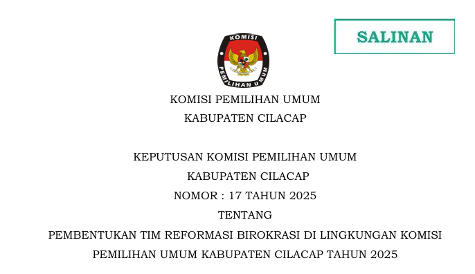 Dalam rangka menindaklanjuti Keputusan KPU Nomor 1334/ORT.04-Kpt/05/KPU/IX/2019 Tentang Petunjuk Pelaksanaan Reformasi di Lingkungan Komisi Pemilihan Umum Provinsi/Komisi Independen Pemilihan Aceh dan Komisi Pemilihan Umum/Komisi Independen Pemilihan Kabupaten/Kota. KPU Kabupaten Cilacap telah membentuk Tim Reformasi Birokrasi di tahun 2025.