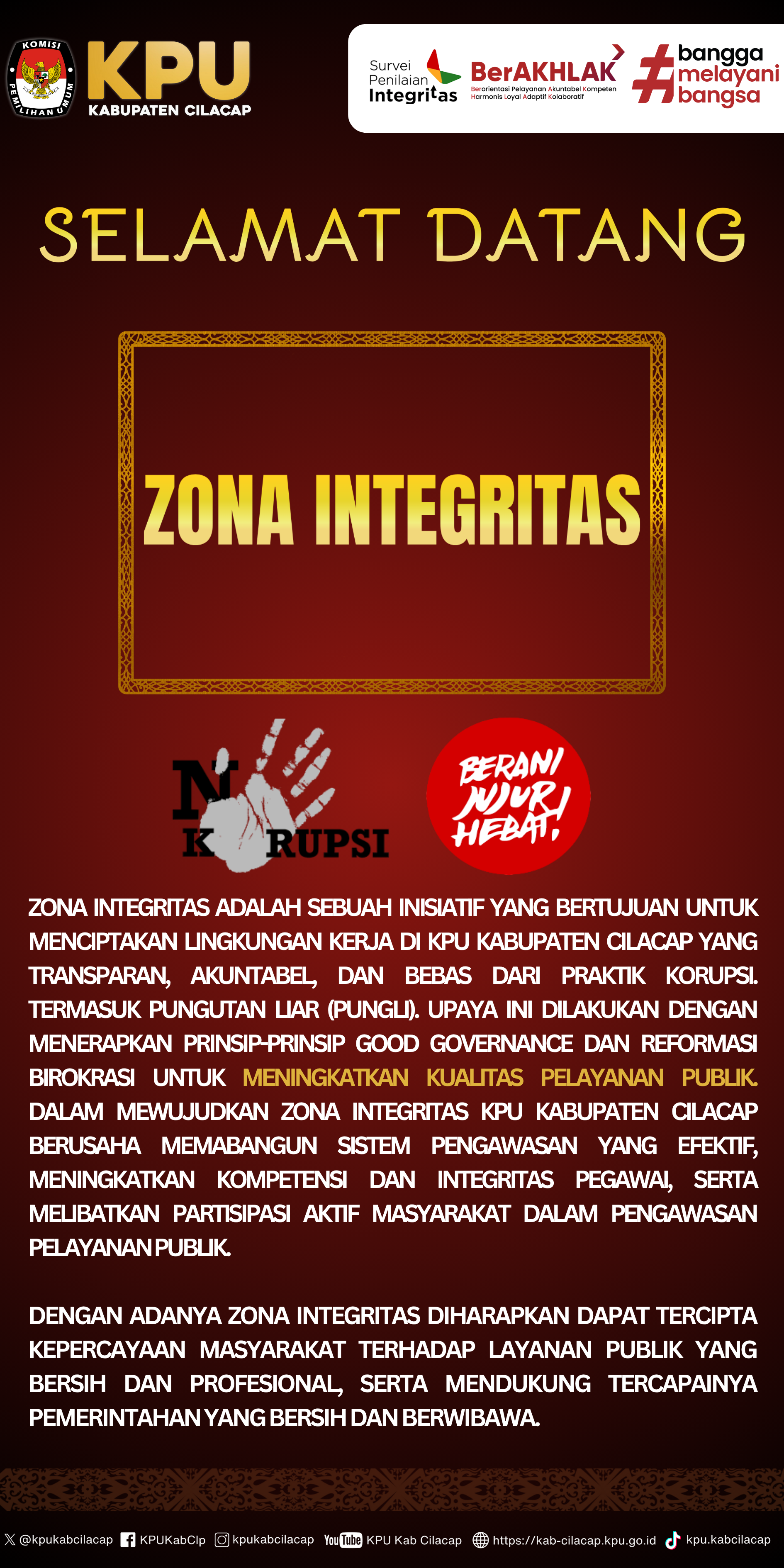 Sebagai unit kerja yang berperan strategis dalam mendukung keberlangsungan organisasi, KPU Kabupaten Cilacap menerapkan prinsip-prinsip Zona Integritas menuju Wilayah Bebas dari Korupsi (WBK) dan Wilayah Birokrasi Bersih dan Melayani (WBBM).